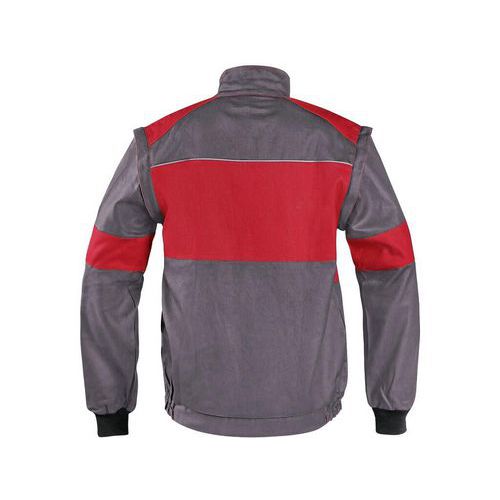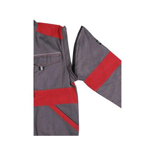 Sivá pánska montérková blúza s červenými doplnkami. Náprsné a predné vrecká schovajú telefón, meter a ďalšie drobné predmety potrebné na prácu. Praktické nosenie zaisťuje sťahovacia guma v páse a rukávy zakončené pružnou manžetou. Odopnutím rukávov je možné blúzu počas chvíľky premeniť na vestu. Kryté zapínanie na zips a zapínanie pri krku. EN ISO 13688: Táto medzinárodná norma určuje všeobecné požiadavky na vyhotovenie ochranných odevov z hľadiska ergonómie, neškodnosti, označenia veľkostí, starnutia, kompatibility a označovania ochranných odevov a na informácie, ktoré sú dodávané výrobcom s ochrannými odevmi.