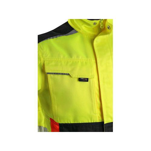 Žlto-čierna výstražná montérková blúza s oranžovými doplnkami.