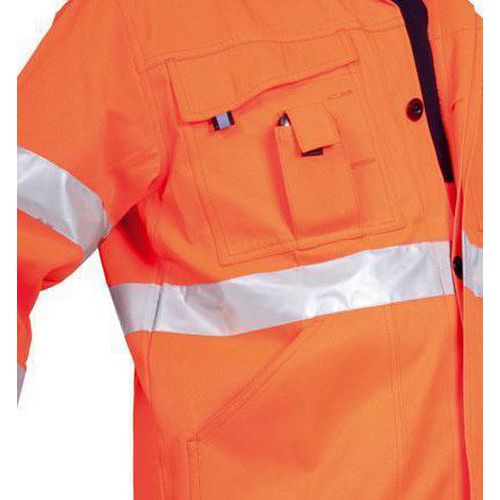 Oranžová výstražná montérková blúza s vysokou viditeľnosťou vo dne i v noci. Náprsné vrecká s menším vreckom na telefón a predné vrecká schovajú drobné predmety potrebné na prácu. Kryté zapínanie na zips a rukávy do manžety. Kvalitné reflexné pruhy 3M v páse a na rukávoch.