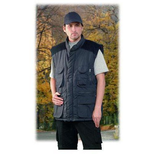 - Čierna zateplená pracovná vesta s ramenami a golierom prešité menčestrom. Vesta má 14 vreciek, z toho tri vnútorné. Možnosť stiahnutia vesty v páse.