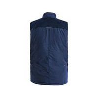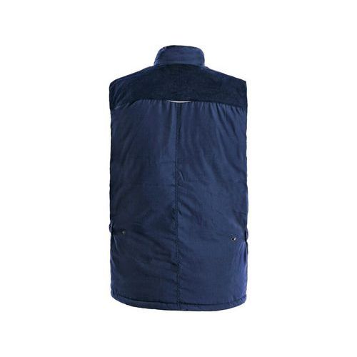 - Modrá zateplená pracovná vesta s ramenami a golierom prešitými menčestrom.