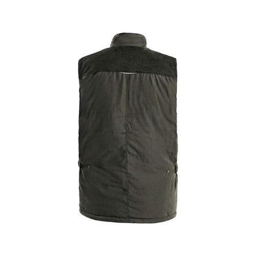 - Zelená zateplená pracovná vesta s ramenami a golierom prešitými menčestrom.