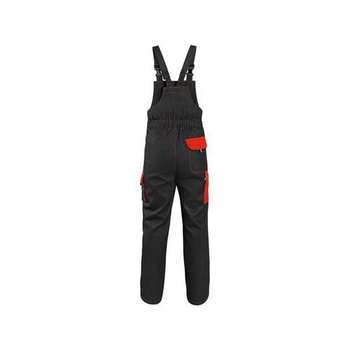 Čierne pánske montérky s náprsenkou s oranžovými doplnkami. Náprsné vrecko na zips, veľké predné a menšie bočné vrecká schovajú telefón, meter a ďalšie drobné predmety potrebné na prácu. Zdvojená vystužená partia kolien pomôže pri častom kľačaní. Traky do gumy so zapínaním na plastovú pracku. EN ISO 13688: Táto medzinárodná norma určuje všeobecné požiadavky na vyhotovenie ochranných odevov z hľadiska ergonómie, neškodnosti, označenia veľkostí, starnutia, kompatibility a označovania ochranných odevov a na informácie, ktoré sú dodávané výrobcom s ochrannými odevmi.