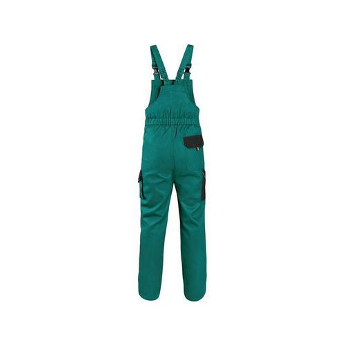 Zelené pánske montérky s náprsenkou s čiernymi doplnkami. Náprsné vrecko na zips, veľké predné a menšie bočné vrecká schovajú telefón, meter a ďalšie drobné predmety potrebné na prácu. Zdvojená vystužená partia kolien pomôže pri častom kľačaní. Traky do gumy so zapínaním na plastovú pracku. EN ISO 13688: Táto medzinárodná norma určuje všeobecné požiadavky na vyhotovenie ochranných odevov z hľadiska ergonómie, neškodnosti, označenia veľkostí, starnutia, kompatibility a označovania ochranných odevov a na informácie, ktoré sú dodávané výrobcom s ochrannými odevmi.