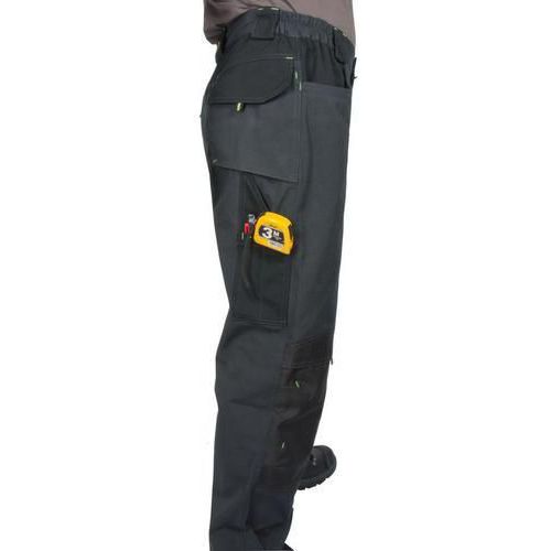 Veľké predné, menšie bočné a zadné vrecká s chlopňou schovajú telefón, meter a ďalšie drobné predmety potrebné na prácu.