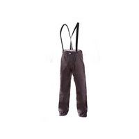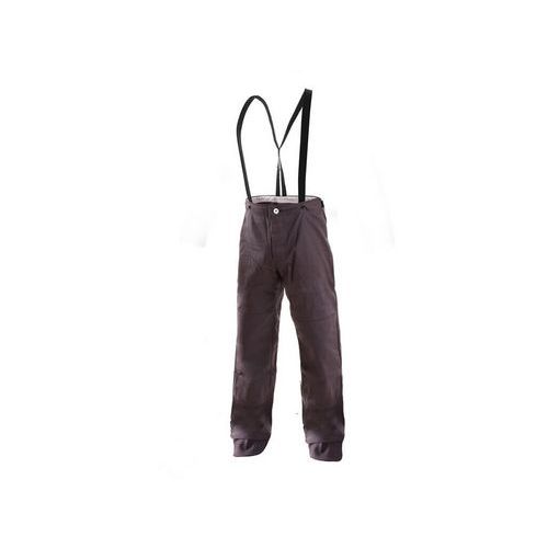 Sivé pánske zváračské nohavice s trakmi. Chráni proti odstrekom roztaveného kovu. Zdvojená partia kolien. Predĺžená predná časť nohavíc čiastočne chráni tiež obuv.