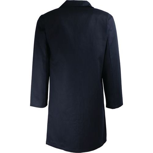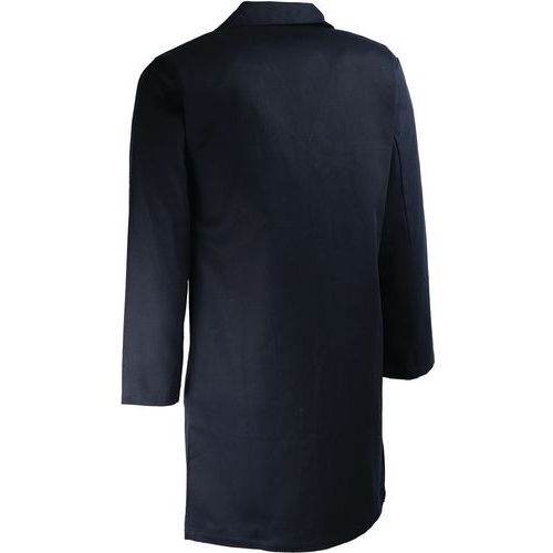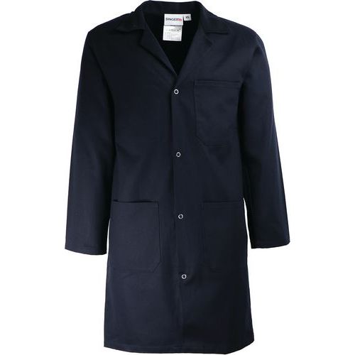 - Pánsky modrý pracovný plášť z bavlny s dlhými rukávmi.
