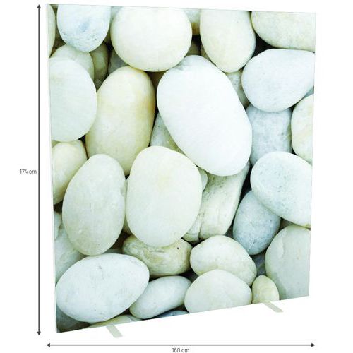 Plátenný panel v rôznych farebných vyhotoveniach na oddelenie priestoru. Plátno je ohňovzdorné v kategórii M1 a je možné ho prať pri 30°. Vybavený dvoma stabilnými nožičkami z bielej lakovanej ocele. Rýchla a jednoduchá montáž plátna.