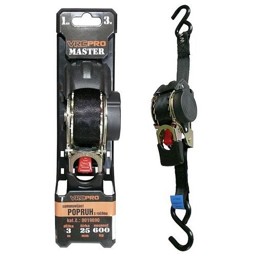 Pás upínací, samonavíjací, s hákmi a račňou, do 600 kg, 25 mm x 3 m