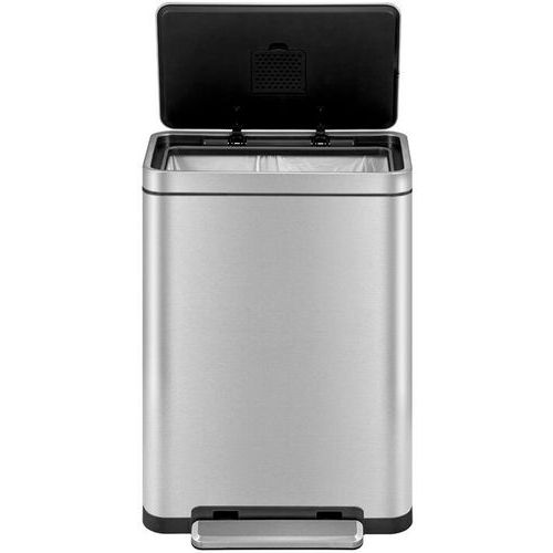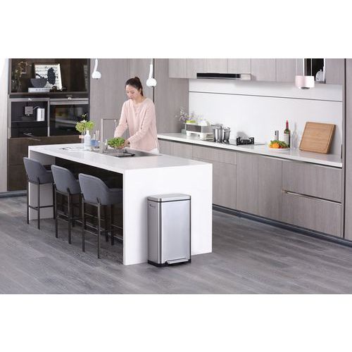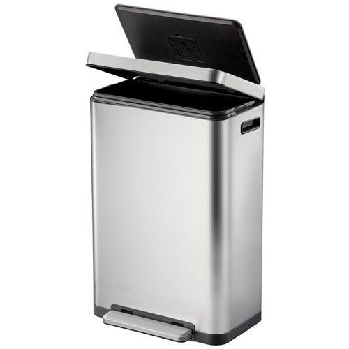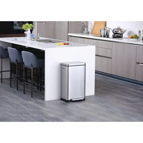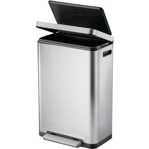 - Elegantný obdĺžnikový odpadkový kôš s extra širokým pedálom, plastovou vložkou, vekom s tichým zatváraním a funkciou stay-open.