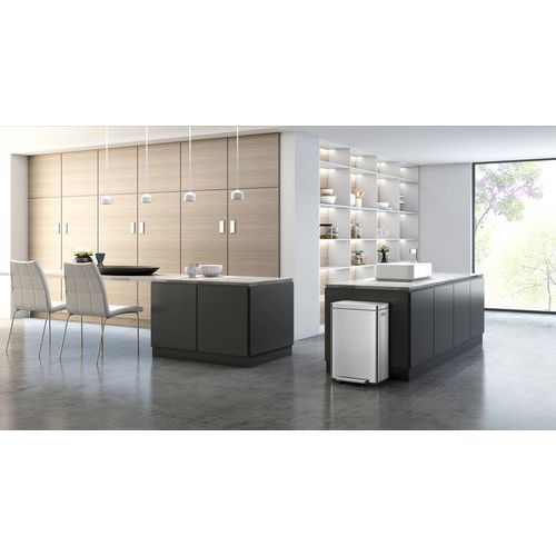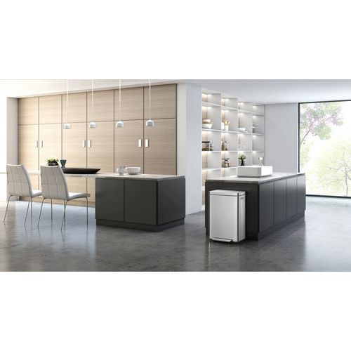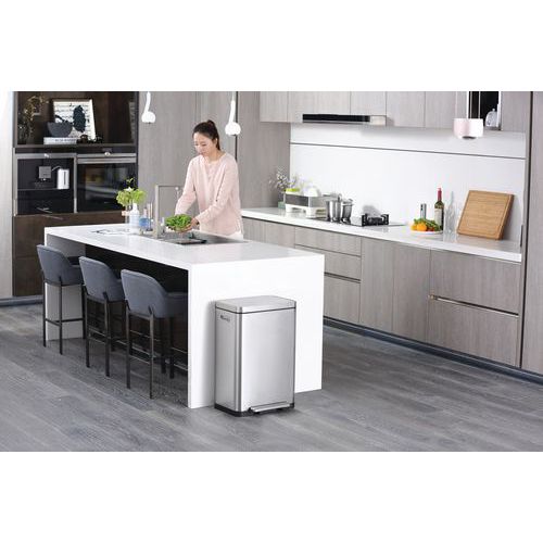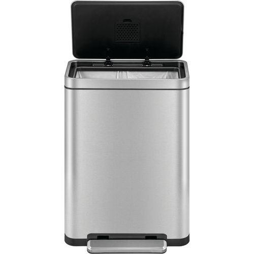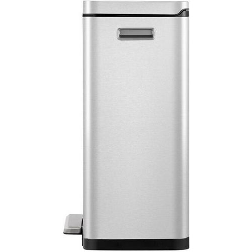 - Elegantný obdĺžnikový odpadkový kôš s extra širokým pedálom, plastovou vložkou, tichým zatváraním veka a funkciou stay-open.