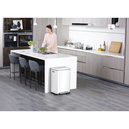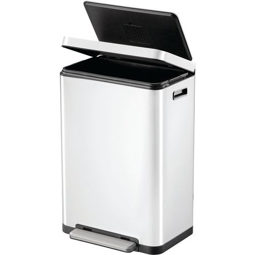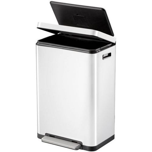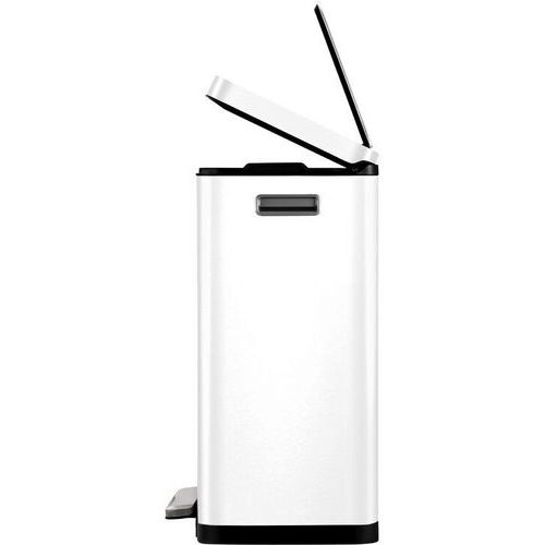 - Elegantný obdĺžnikový odpadkový kôš s extra širokým pedálom, plastovou vložkou, tichým zatváraním veka a funkciou stay-open.