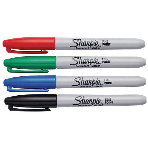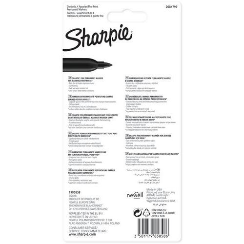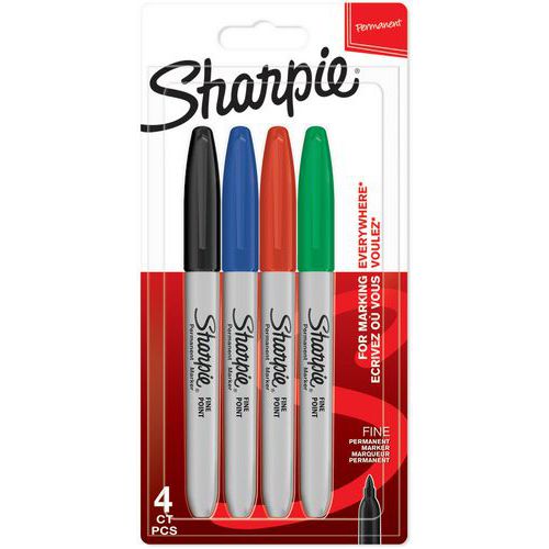 Permanentné popisovače Sharpie s jemným hrotom. Balenie so štyrmi rôznymi farbami. Ideálne na použitie v kanceláriách, laboratóriách, logistike aj v domácnostiach. Permanentný atrament na použitie na papier, karty, plast, sklo, kov a väčšinu ďalších povrchov. Odolný atrament, ktorý sa nerozmazáva, rýchlo schne a je vodeodolný. Intenzívne, živé farby: čierna, modrá, červená, zelená.