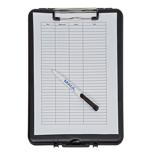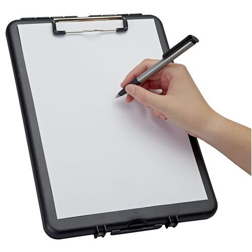 - Plastový klipboard s pevnou písacou plochou a úložným priestorom.