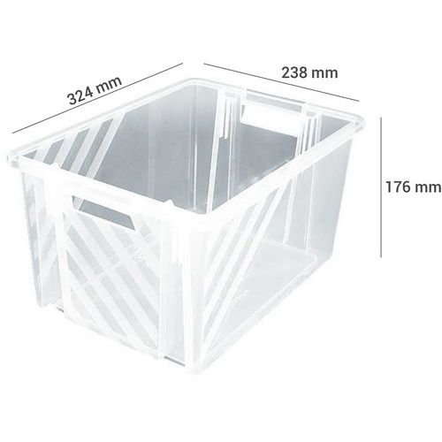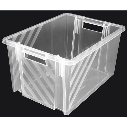 Stohovateľný kontajner s rukoväťami pre ľahkú manipuláciu. Vysoká odolnosť voči mechanickým a chemickým vplyvom. Možnosť stohovania na seba. Vystužené steny pre vyššiu pevnosť.