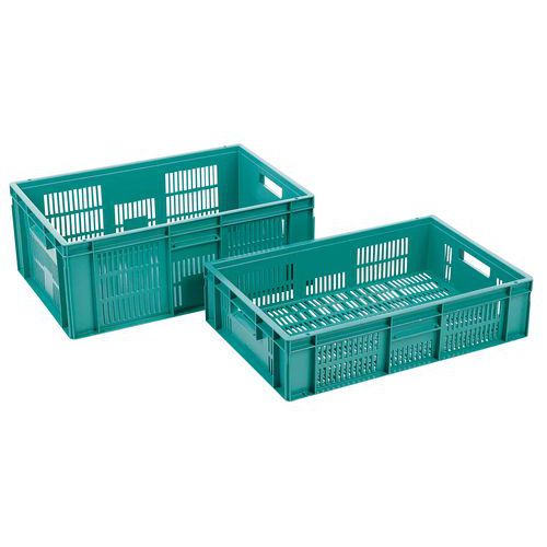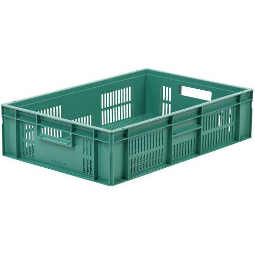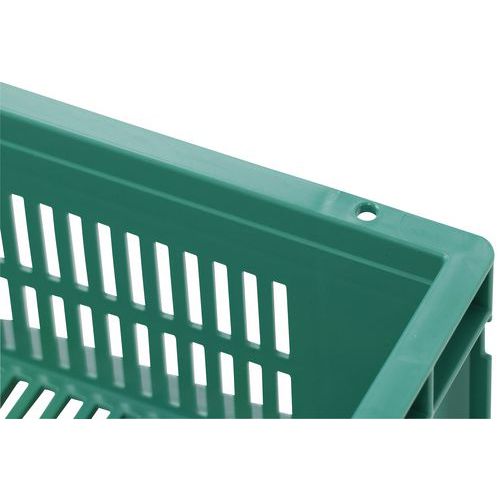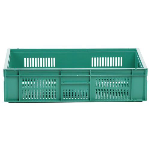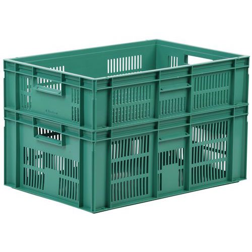 Veľmi robustné stohovacie plastové boxy v zelenom prevedení. Perforované bočné steny boxu. Vysoká stabilita stohovania vďaka zosilneným okrajom.