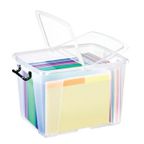 Robustné plastové úložné boxy s pevnými stenami vystuženými na 4 stranách. Kónický tvar zaručuje perfektné stohovanie a skladanie do seba. Jednoduchý prístup po stranách vďaka dvojitému klopnému krytu. Efektívne uzatváranie vďaka 2 robustným zacvakávacím rukovätiam. Ideálne boxy na archiváciu, ukladanie dokumentov a úsporu miesta.