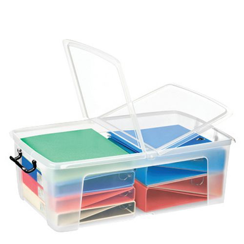 Robustné plastové úložné boxy s pevnými stenami vystuženými na 4 stranách. Kónický tvar zaručuje perfektné stohovanie a skladanie do seba. Jednoduchý prístup po stranách vďaka dvojitému klopnému krytu. Efektívne uzatváranie vďaka 2 robustným zacvakávacím rukovätiam. Ideálne boxy na archiváciu, ukladanie dokumentov a úsporu miesta.