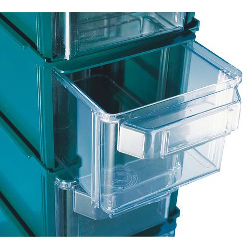- Vnútorná vysúvacia časť vyrobená z transparentného plastu umožňuje rýchlu kontrolu obsahu boxu.