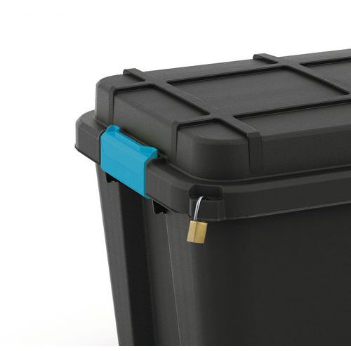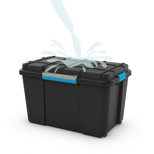 Plastové úložné boxy s klipsovým, hermeticky uzavretým vekom na univerzálne použitie. Boxy sú odolné proti striekajúcej vode (IP44). Modré kolieska a postranné držadlá pre ľahkú manipuláciu. Stohovateľné. Stupeň krytia IP44: Ochrana pred vniknutím predmetov väčších ako 1 mm, chránené proti striekajúcej vode.