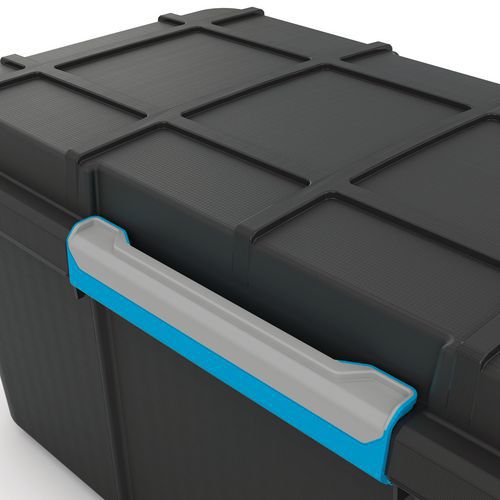 Plastové úložné boxy s klipsovým, hermeticky uzavretým vekom na univerzálne použitie. Boxy sú odolné proti striekajúcej vode (IP44). Modré kolieska a postranné držadlá pre ľahkú manipuláciu. Stohovateľné. Stupeň krytia IP44: Ochrana pred vniknutím predmetov väčších ako 1 mm, chránené proti striekajúcej vode. Vyrobené v EÚ