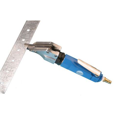 - Pneumatické nožnice na plech v rovnom vyhotovení s dvoma pevnými postrannými nožmi a poháňaným stredným nožom.