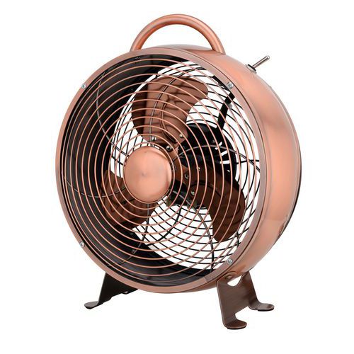 - Podlahový ventilátor v štýlovom retro dizajne s medenou konštrukciou, mriežkou aj lopatkami.