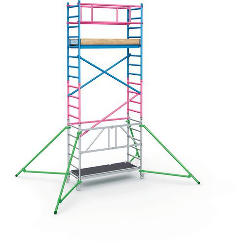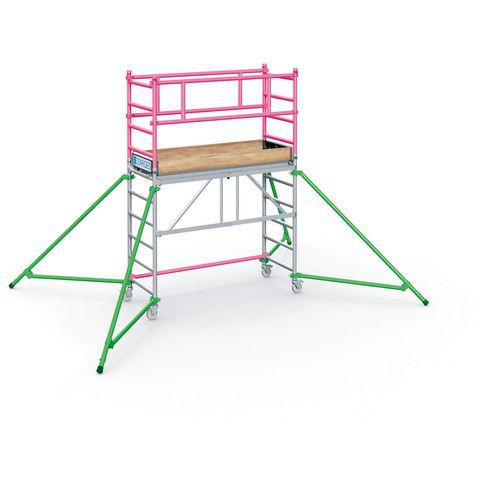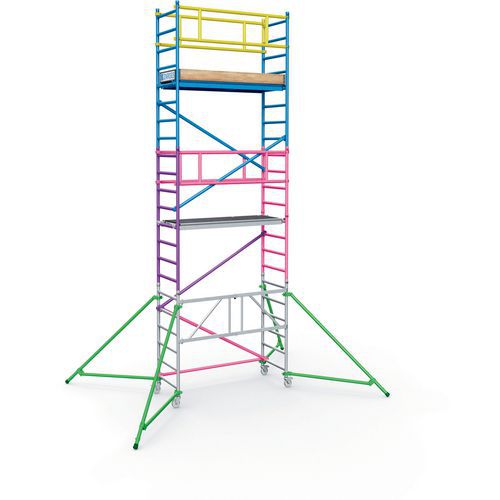 Mobilné lešenie v šiestich rôznych veľkostiach na bezpečné vykonávanie prác pri montážach, opravách a údržbe vo výškach.