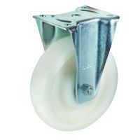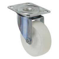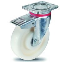 Transportné otočné kolesá s bielou nylonovou obručou. Nízky valivý odpor. typ kolies: otočné materiál kolies: nylon priemer kolesa: 100 – 200 mm šírka kolesa: 35 – 50 mm nosnosť: 150 – 250 kg spôsob prichytenia: vidlica s prírubou výška kolesa s vidlicou: 128 – 235 mm vyloženie kolesa: 40 – 60 mm ložiská: valivé (ihlové) povrchová úprava pozinkovaním, dvojradový guľkový veniec vo vidlicovej hlave, teplotná odolnosť -20 až +80 °C, krátkodobá teplotná odolnosť -40 až +120 °C, odolné proti korózii, odolnosť (oleje, tuky, chemikálie)