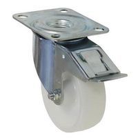 Transportné otočné kolesá s brzdou a bielou nylonovou obručou. Nízky valivý odpor. typ kolies: otočné s brzdou materiál kolies: nylon priemer kolesa: 100 – 200 mm šírka kolesa: 35 – 50 mm nosnosť: 150 – 250 kg spôsob prichytenia: vidlica s prírubou výška kolesa s vidlicou: 128 – 235 mm vyloženie kolesa: 40 - 60 mm ložiská: valivé (ihlové) brzda otáčania, povrchová úprava pozinkovaním, dvojradový guľkový veniec vo vidlicovej hlave, teplotná odolnosť -20 až +80 °C, krátkodobá teplotná odolnosť -40 až +120 °C, odolné proti korózii, odolnosť (oleje, tuky, chemikálie)