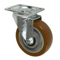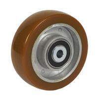 Transportné koleso s priemerom 100 mm s polyuretánovým behúňom. Behúň odolný proti bočným nárazom a mnohým chemikáliám, nezanecháva stopy na podlahe a zaručuje tichý chod. Dvojité utesnené guľkové ložiská. Tvrdosť behúňa 92° Shore A.