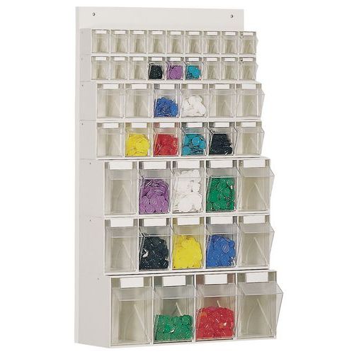 Kompletná sada výklopných zásobníkov na zavesenie na stenu So 4 radmi priehľadných výklopných priehradok pre prehľadný obsah.