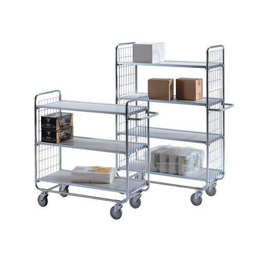 - Vysoké policové vozíky so štyrmi policami a dvoma mrežovanými bočnicami.