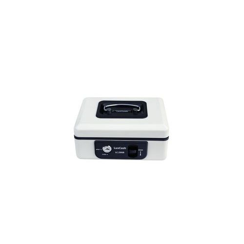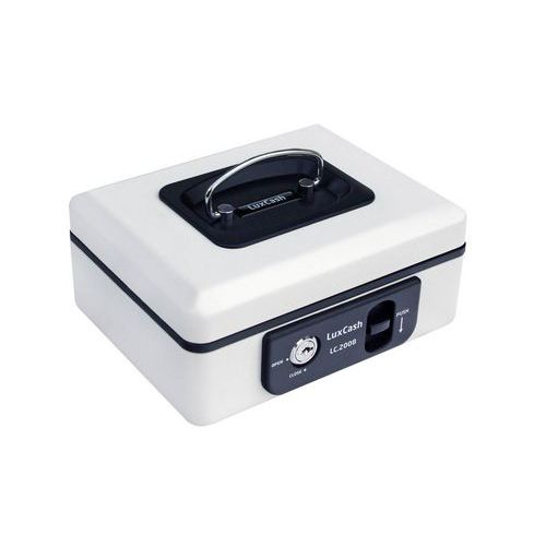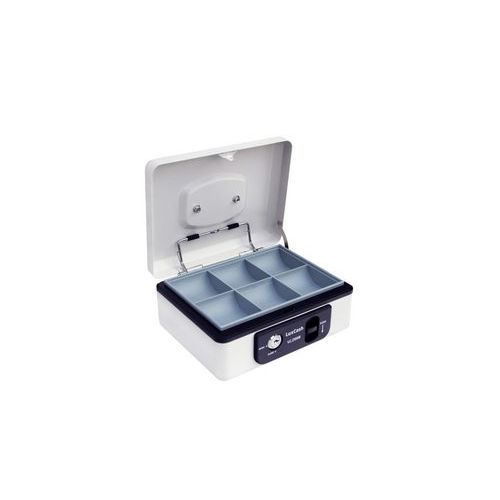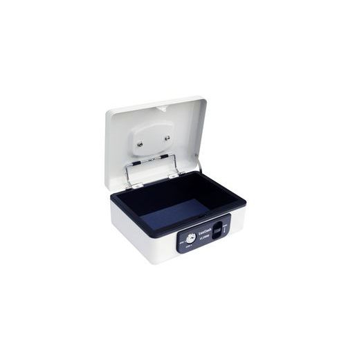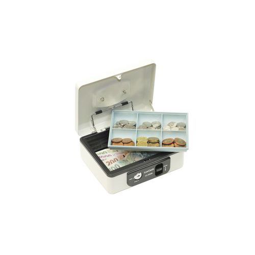 - Oceľová pokladnička s páčkou na pohodlné otvorenie veka a blokáciou proti jeho samovoľnému zatvoreniu.