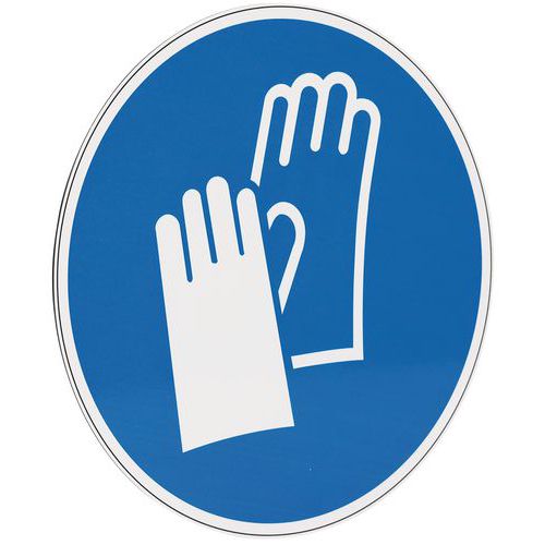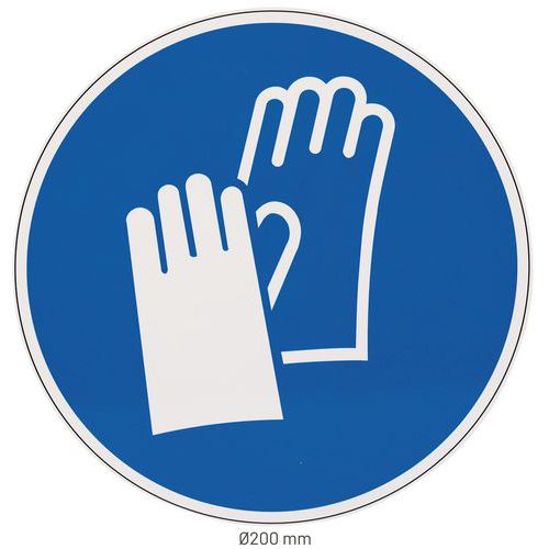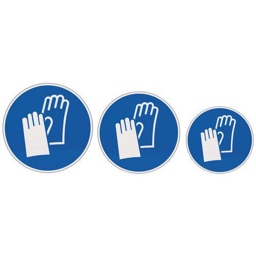 - Príkazové okrúhle značenie pre určenie povinnosti nosiť ochranné rukavice pre zaistenie optimálnej bezpečnosti.