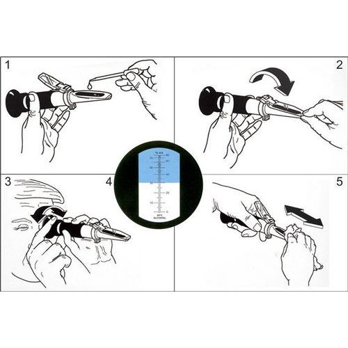 Časť prístroja je opatrená mäkkým, gumeným krytom kvapnúť kvapku meranej látky na zošikmený optický hranol prístroja, priklopiť krytku hranola (látka sa rozprestrie), počkať niekoľko sekúnd, až sa vyrovnajú teploty kvapky a refraktometra, pozrieť sa proti svetlu do okulára prístroja, prípadne ho zaostriť a na príslušnej stupnici v zornom poli sa dá ihneď odčítať chou handričkou. Na presné meranie je nevyhnutné dodržať referenčnú teplotu 20 °C. 60 ~ 80 % , W/W, presnosť: 1 % - 2,5 %