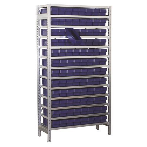 - Kovový regál s trinástimi policami a vysúvacími boxami určený na prehľadné uskladňovanie drobného materiálu pre dielne, sklady, autoserivsy, obchody a pod. Možnosť dokúpiť deliace priečky pre boxy. Povrchová úprava pozinkovaním.