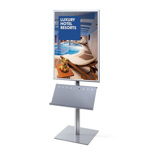 Informačné stojany s rámom na plagáty. V spodnej časti sa nachádza priestor na umiestnenie plechového obalu na brožúry, katalógy a iné prospekty. Klip rám s ostrými rohmi a profilom 25 mm.