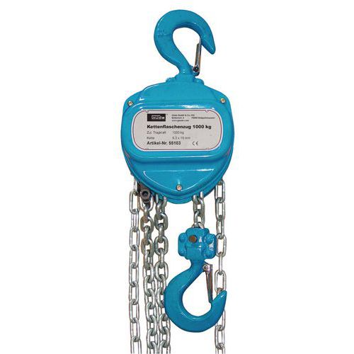- Reťazový kladkostroj na zvislé zdvíhanie bremien najrôznejšieho druhu s hmotnosťami do 1 000 kg. Háky sú vybavené poistkou proti vypadnutiu bremena.