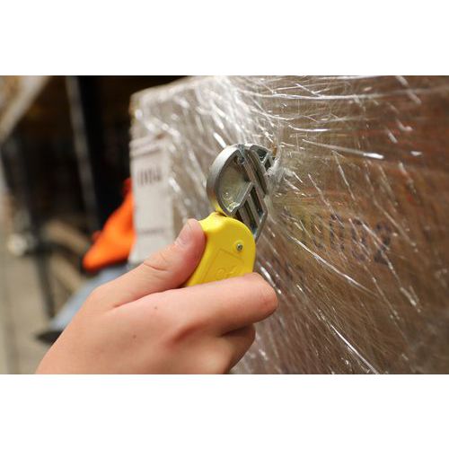 Nôž na rezanie fólií a kartónov s vymeniteľnou čepeľou. Zakrytá čepeľ bez ostrých špíc poskytuje maximálnu bezpečnosť pre používateľov aj tovar. Praktický otvor na zavesenie noža. Odporúčané použitie na kartóny, elastické a zmršťovacie fólie, lepiace pásky a plastové sťahovacie pásky.