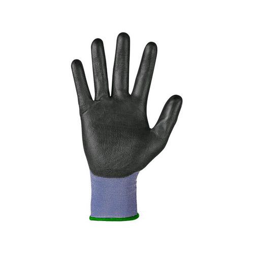 - Pletené bezšvíkové rukavice s pružnou manžetou, dlane a prsty povrstvené polyuretánom. Hustota tkania 18 G pre väčšiu flexibilitu a citlivosť.