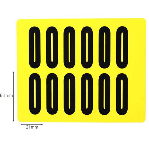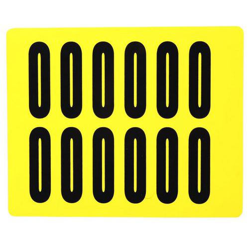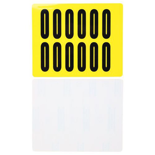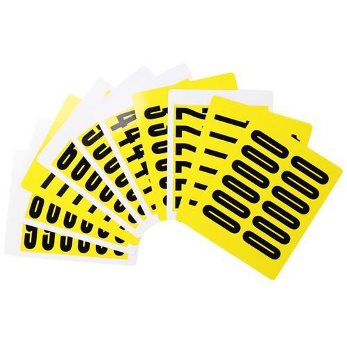 Čierne číslice na žltom podklade vyrobené z vinylu sa dodávajú v ôsmich rôznych veľkostiach. Desať rôznych číslic 0 – 9 je vysoko viditeľných a majú jednoduchú aplikáciu. Pri odstránení nezanechávajú stopy. Je možné využiť v kancelárii, sklade i vo výrobných závodoch. Balenie obsahuje 10 hárkov, každý s počtom etikiet meniacim sa podľa veľkosti etikety. typ upevnenia: samolepiace farba: žltá materiál: plast počet etikiet v hárku: 1 – 168 balenie: 10 hárkov