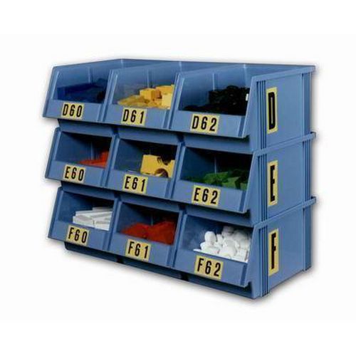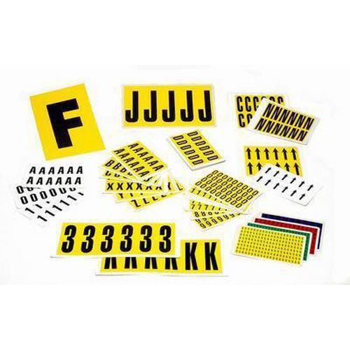 Čierne písmená na žltom podklade vyrobené z vinylu sa dodávajú v ôsmich rôznych veľkostiach. Dvadsaťšesť rôznych písmen A – Z, bez diakritiky, sú vysoko viditeľné a majú jednoduchú aplikáciu. Pri odstránení nezanechávajú stopy. Je možné využiť v kancelárii, sklade i vo výrobných závodoch. Balenie obsahuje 26 hárkov, každý s počtom etikiet meniacim sa podľa veľkosti etikety. typ upevnenia: samolepiace farba: žltá materiál: plast počet etikiet v hárku: 1 – 168 balenie: 26 hárkov