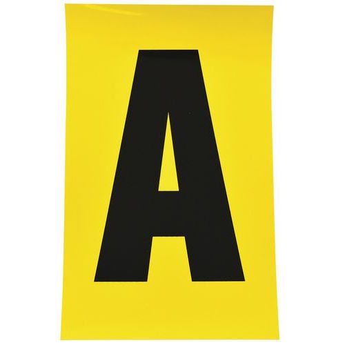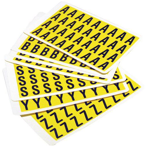 Čierne písmená na žltom podklade vyrobené z vinylu sa dodávajú v ôsmich rôznych veľkostiach. Dvadsaťšesť rôznych písmen A – Z, bez diakritiky, sú vysoko viditeľné a majú jednoduchú aplikáciu. Pri odstránení nezanechávajú stopy. Je možné využiť v kancelárii, sklade i vo výrobných závodoch. Balenie obsahuje 26 hárkov, každý s počtom etikiet meniacim sa podľa veľkosti etikety. typ upevnenia: samolepiace farba: žltá materiál: plast počet etikiet v hárku: 1 – 168 balenie: 26 hárkov