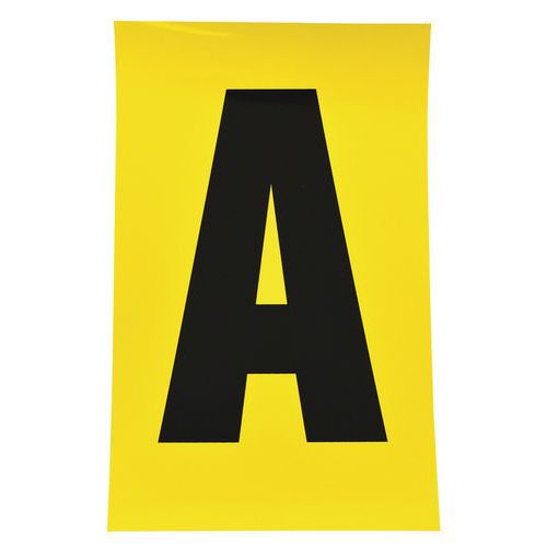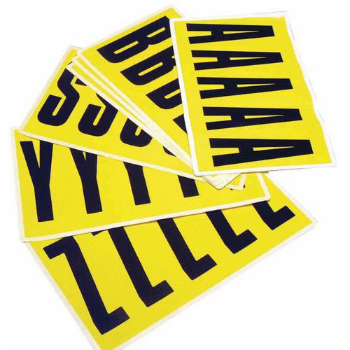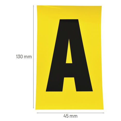 Čierne písmená na žltom podklade vyrobené z vinylu sa dodávajú v ôsmich rôznych veľkostiach. Dvadsaťšesť rôznych písmen A – Z, bez diakritiky, sú vysoko viditeľné a majú jednoduchú aplikáciu. Pri odstránení nezanechávajú stopy. Je možné využiť v kancelárii, sklade i vo výrobných závodoch. Balenie obsahuje 26 hárkov, každý s počtom etikiet meniacim sa podľa veľkosti etikety. typ upevnenia: samolepiace farba: žltá materiál: plast počet etikiet v hárku: 1 – 168 balenie: 26 hárkov