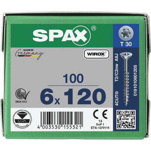 - Vysoko kvalitné univerzálne skrutky SPAX s plnými závitmi sú navrhnuté pre rýchlu, efektívnu a čistú prácu v dreve, bez nutnosti predvŕtania.
