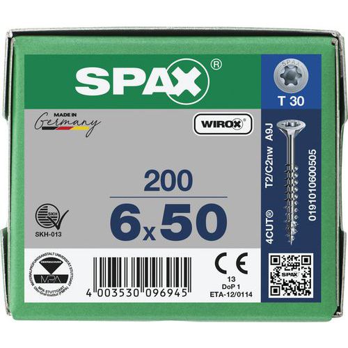 - Vysoko kvalitné univerzálne skrutky SPAX s plnými závitmi sú navrhnuté pre rýchlu, efektívnu a čistú prácu v dreve, bez nutnosti predvŕtania.