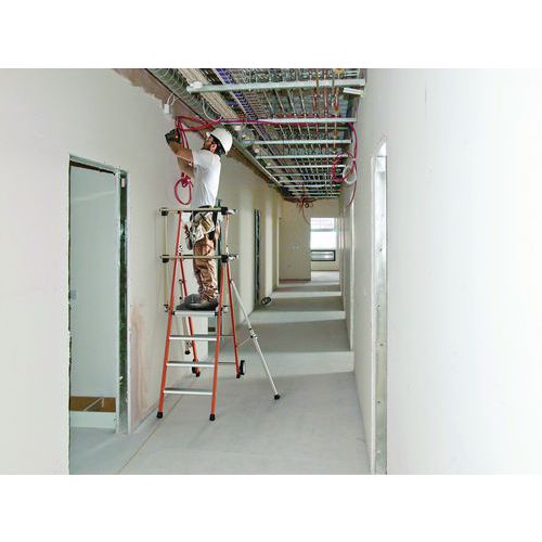 Pracovné plošiny s izoláciou Sherpa Fiber. Stojiny zo sklených vlákien - izolačný materiál pre bezpečnú prácu proti nízkym napäťovým prúdom do 1 500 voltov. náradie - nosnosť 25 kg, s integrovanými háčikmi (10 kg). Sklopné stabilizátory s milimetrovým nastavovacím systémom. Vysoko komfortná 590 x 400 mm protišmyková platforma z dreva. Pojazdové kolesá do každého terénu. Platforma sa počíta ako jeden krok. Záruka výrobcu pre zákazníka : 2 roky Max. zaťaženie (kg) : 150 kg
