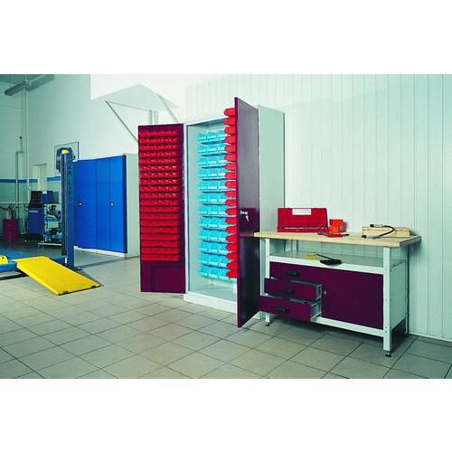 Zváraná skriňa s plastovými boxmi a s dverami je vyrobená z kvalitného oceľového plechu. Krídla dverí sú vybavené profilovými výstuhami zvyšujúcimi pevnosť a odolnosť proti vylomeniu. Možnosť ľubovoľného prestavenia boxov v rastri 2,5 cm. Rozmery boxov - malé (v x š x h): 5,6 x 7,7 x 11,9/9 cm. Nosnosť boxov 3 kg. Rozmery boxov - veľké (v x š x h): 10,8 x 14,4 x 24,4/17 cm. Nosnosť boxov 0,2 kg. Počet boxov - malé: 160 ks. Počet boxov - veľké: 72 ks.