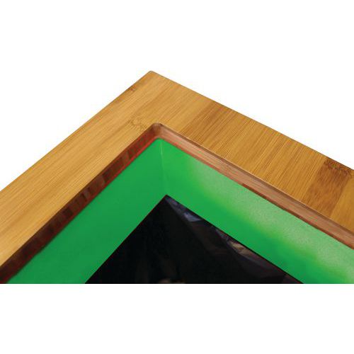 - Stanica na triedenie odpadu z pozinkovanej ocele s elegantným a odolným bambusovým otvárateľným vekom, s farebným indikátorom prietoku a štítkom.